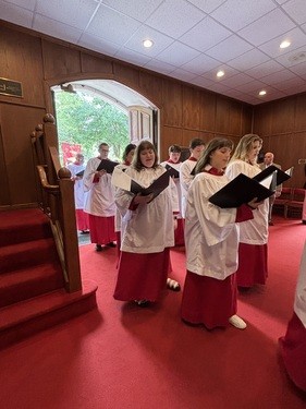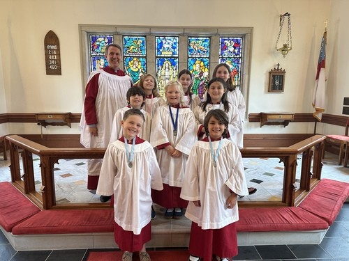 The Choristers follow the Royal School of Church Music program in which they work through several levels of achievement (represented by colored ribbons) as they learn to sing, read music, and become leaders in worship. In addition to singing, various fun activities are offered, including a yearly choir camp.